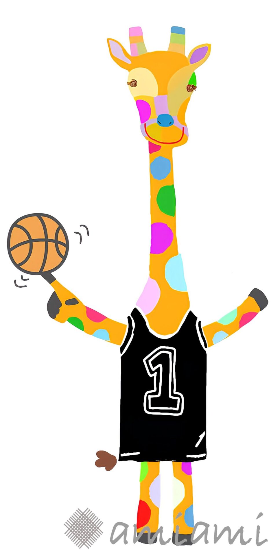 作品には、カラフルな模様のキリンがバスケットボールを持っている姿が描かれています。明るくポップな色使いが特徴で、見る人に元気と笑顔を届けるような温かい印象を与えます。