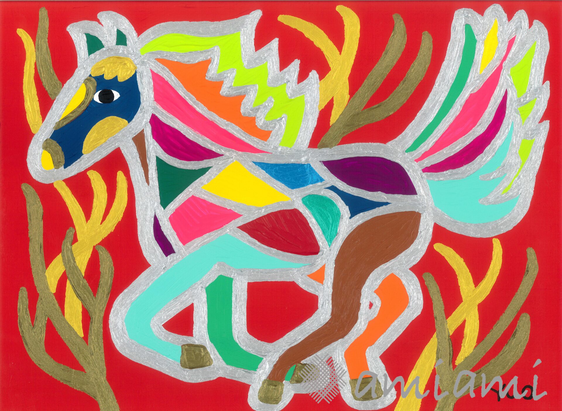 鮮やかな色彩と力強い線で描かれた疾走する馬が、新年のスタートダッシュを連想させる作品です。