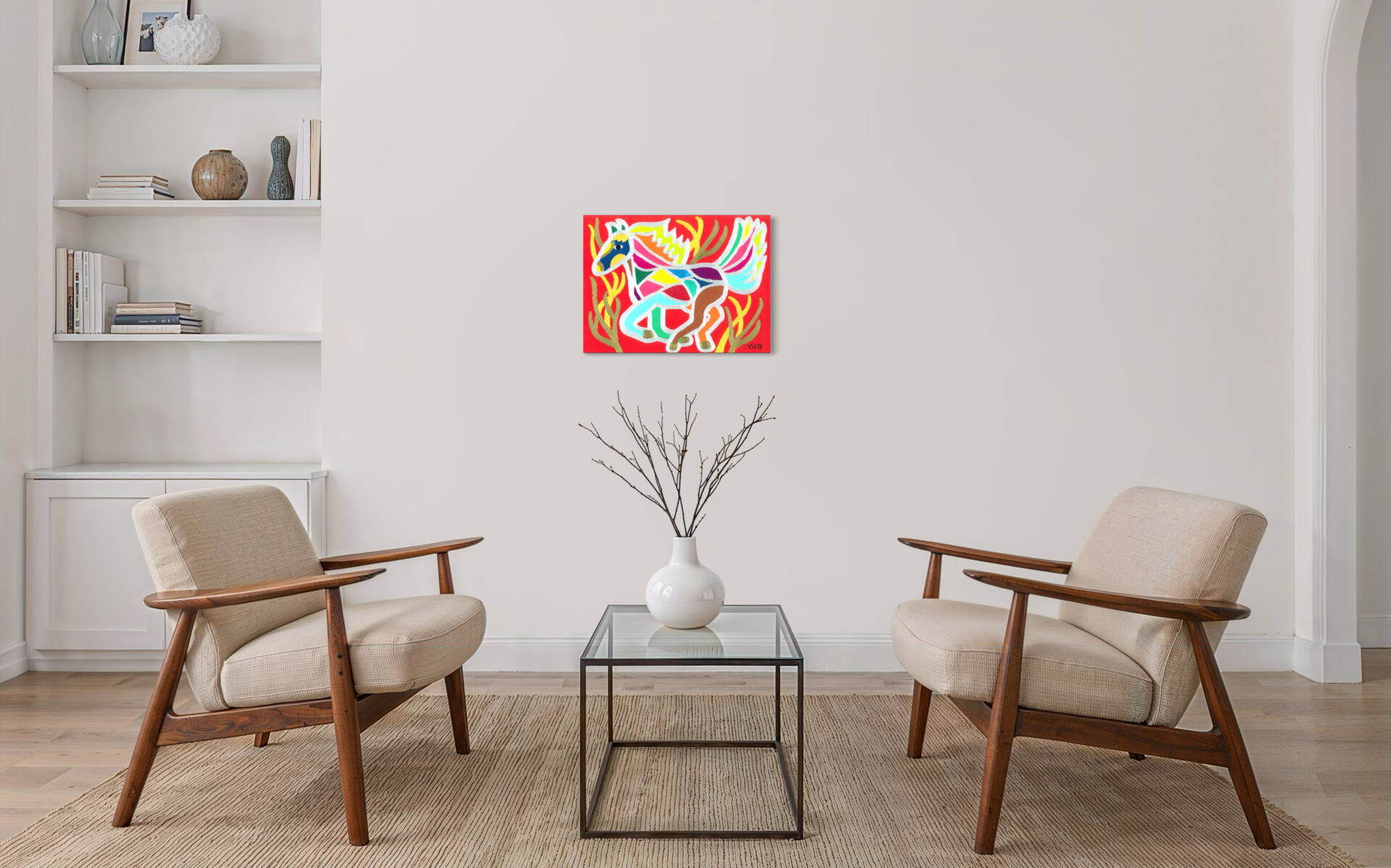 躍動感あふれる姿は、幸運と成長を呼び込む力を感じさせます。背景の温かい赤が情熱を、カラフルな身体が多様な可能性を表現しているようにも見えます。